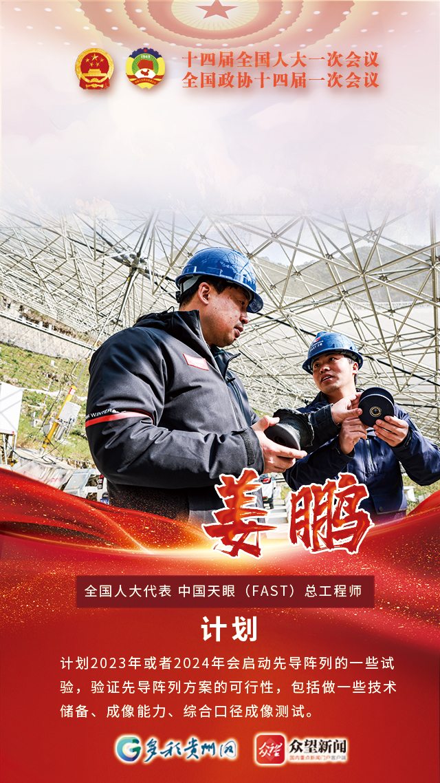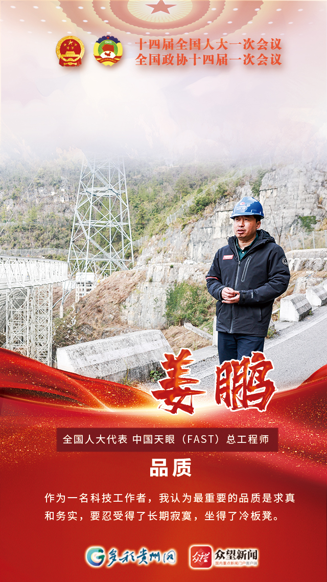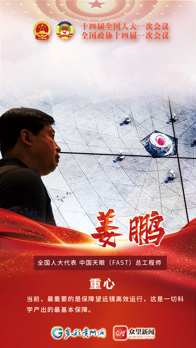 “中国天眼”坐落于贵州平塘县,是目前世界上最大、最灵敏的单口径射电望远镜。第十四届全国人大代表姜鹏是中国天眼(FAST)总工程师,在他和团队的努力下,“中国天眼”工程建设调试任务圆满完成,综合性能达到国际领先水平。