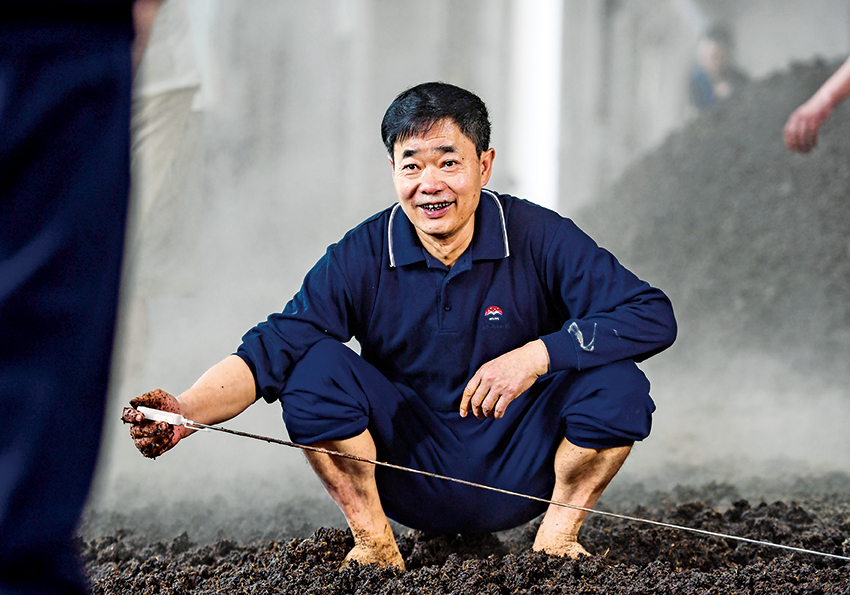 严刚测量酒醅温度,判断堆积发酵情况(贵州日报天眼新闻记者 / 陈慧 摄)