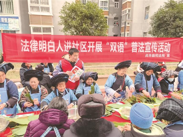 黔西南州贞丰县水井湾社区“法律明白人”用“双语”向社区居民开展普法宣传。(省司法厅供图)