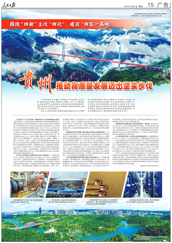 3月4日,《人民日报》整版刊发《贵州推动高质量发展迈出坚实步伐》,聚焦贵州省坚持以高质量发展统揽全局,坚定不移围绕“在新时代西部大开发上闯新路、在乡村振兴上开新局、在实施数字经济战略上抢新机、在生态文明建设上出新绩”。